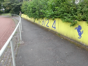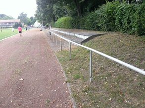 Der Platz hat auf einer Längsseite zwei Stufen, welche auf Höhe der Mittellinie als eine Art überdachte Terasse ausgebaut sind. Um den Platz gibt es eine Aschenlaufbahn.