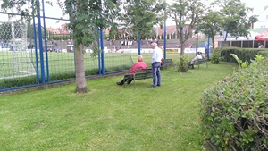 Auf der einen Platzlänge eine überdachte Sitzplatztribüne über dreiviertel der Länge des Platzes. Die andere Längsseite wird von einer stolprigen Traverse geziert.